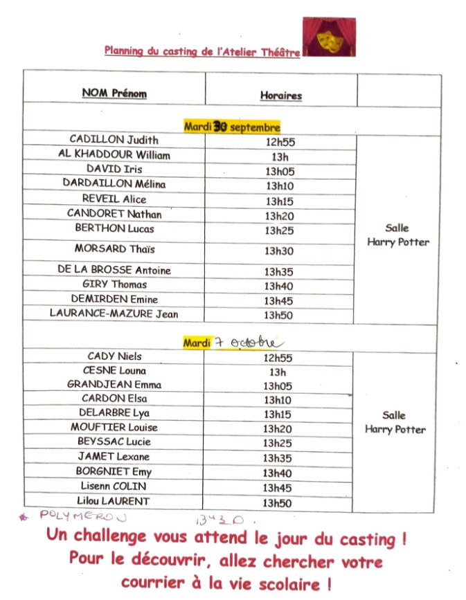 [Atelier théâtre] Tous en scène 2025-2026 - Liste des passages au casting des 30 septembre et 7 octobre