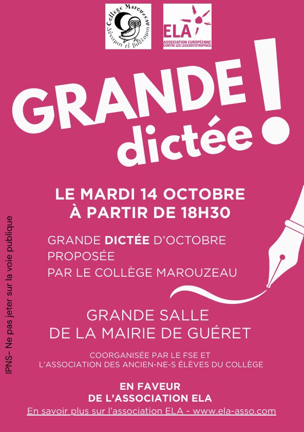 18h30 : GRANDE DICTEE ELA à la grande salle de la Mairie de Guéret