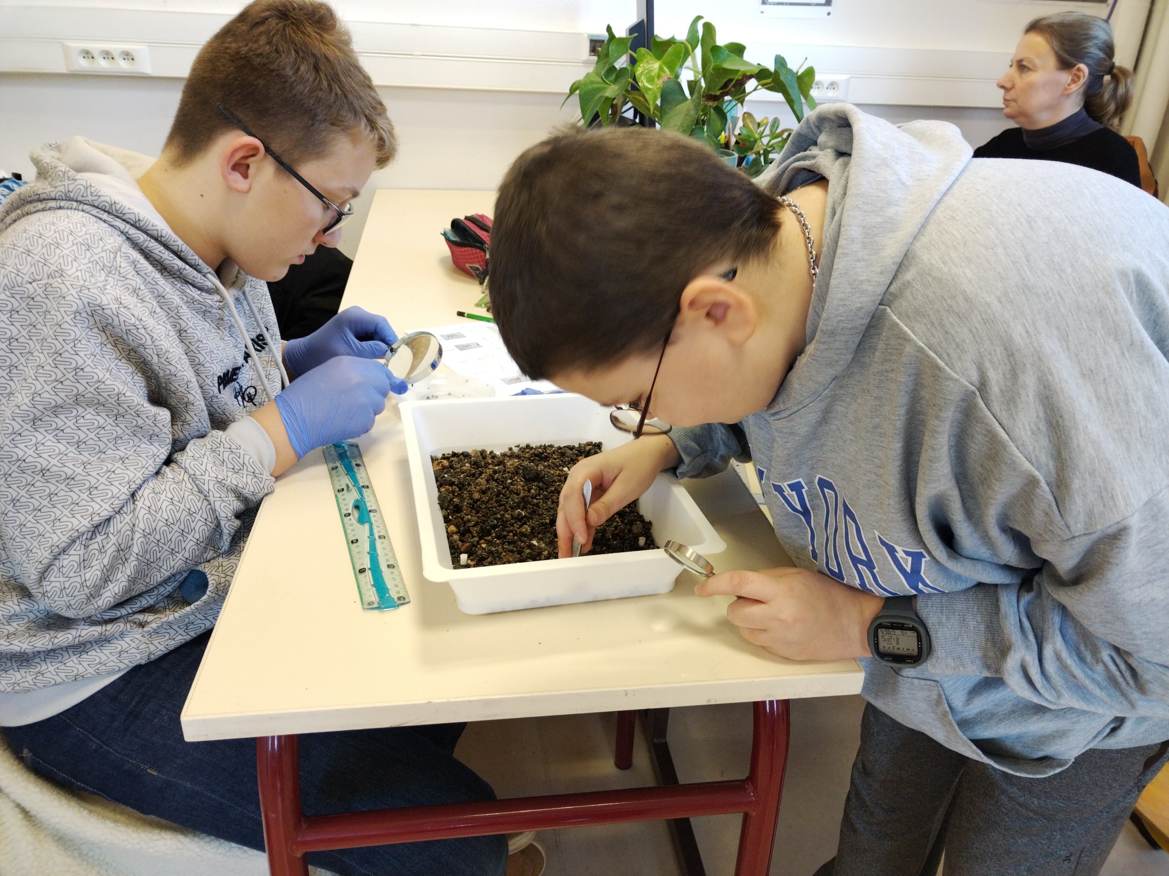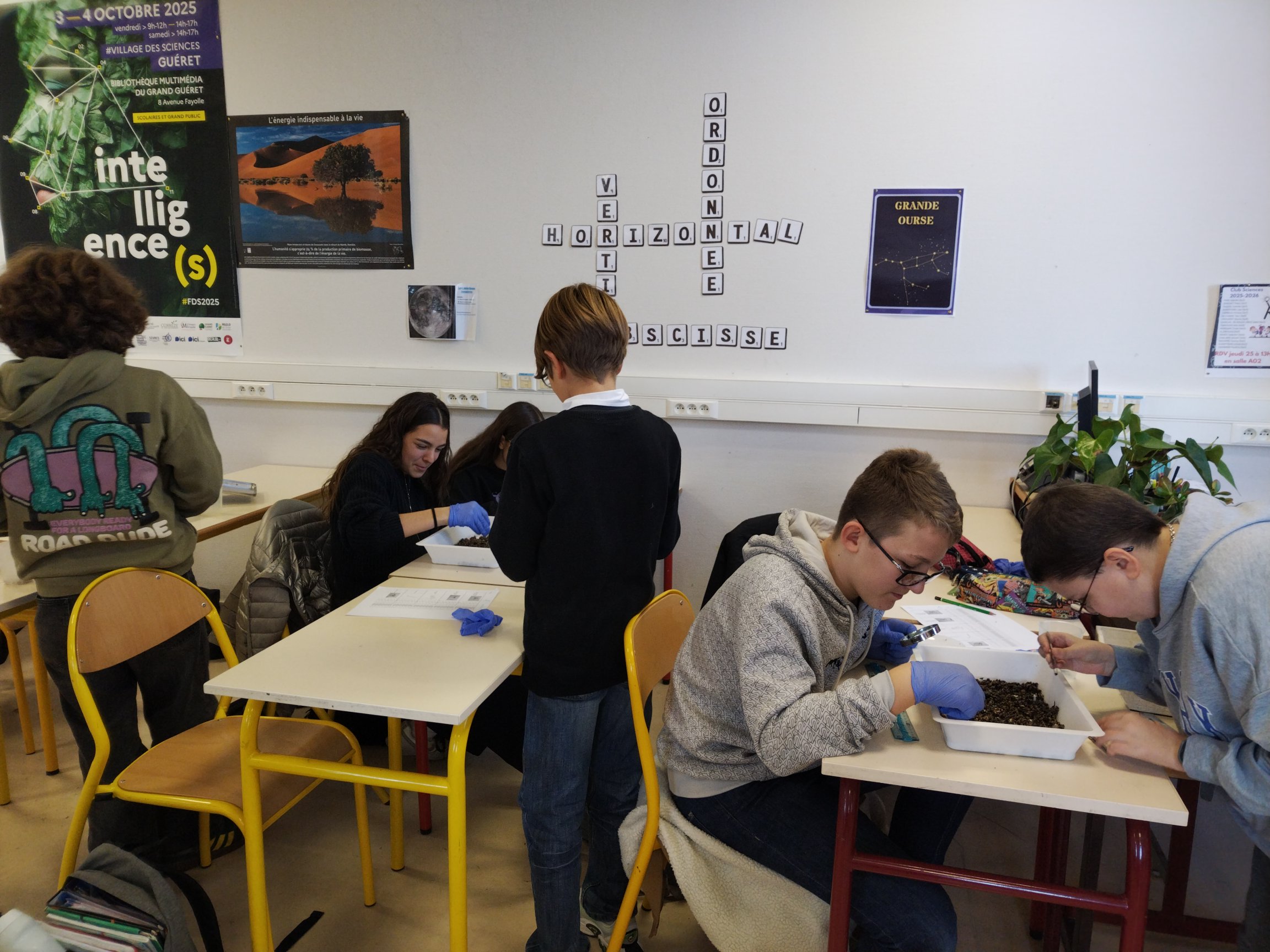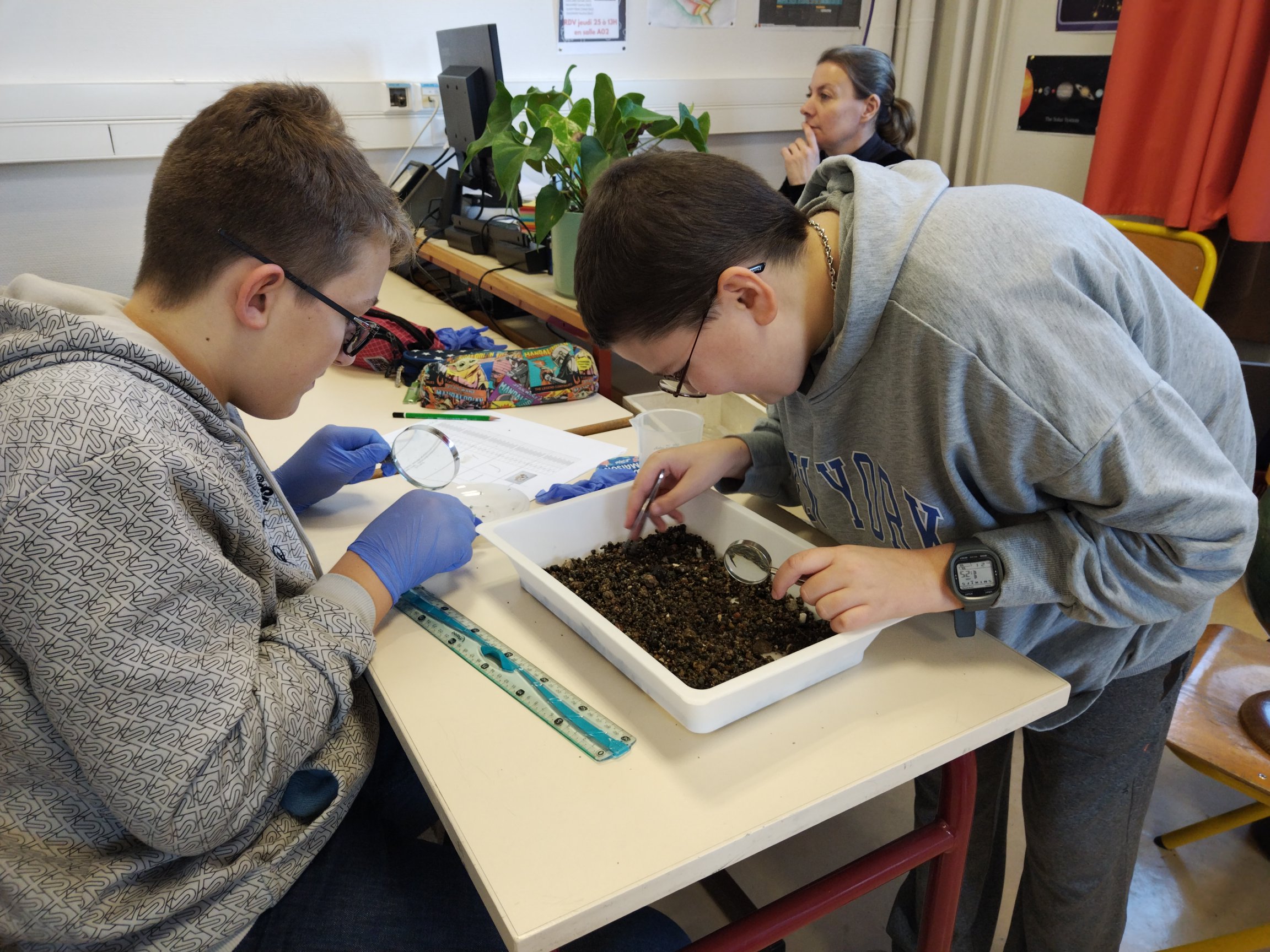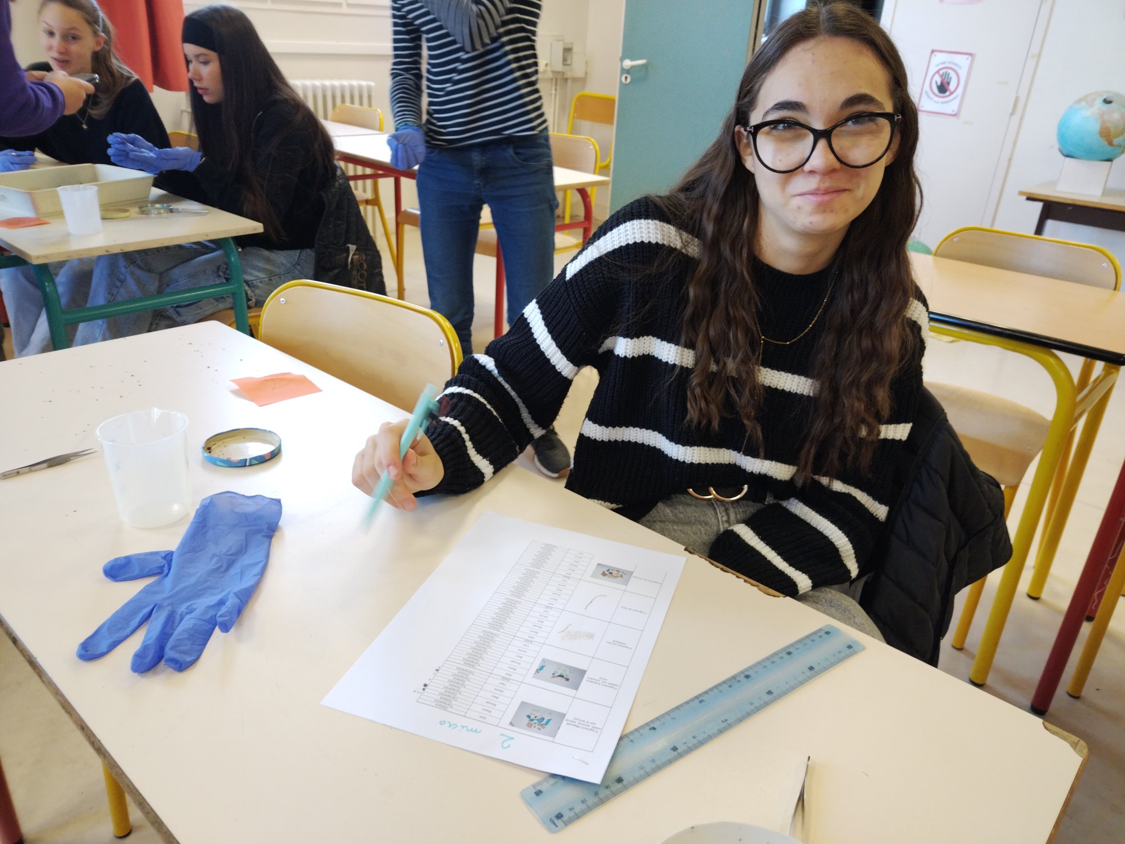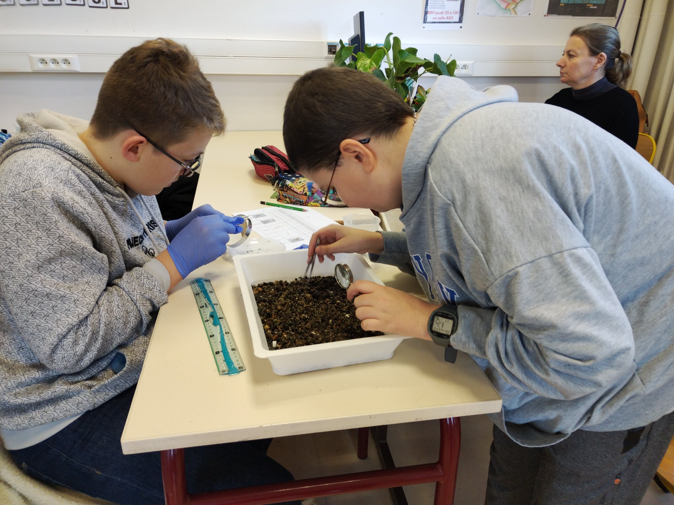 Les élèves du Club Sciences ont pu analyser les prélèvements du ruisseau des Chers. Pour cela, ils ont prélevé les mésoplastiques et microplastiques à l'aide d'une pince fine et d'une loupe.